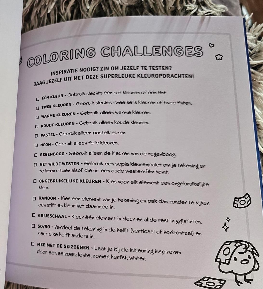 Net zoals de andere Cozy kleurboeken vind je een checklist met kleurplaten die je nog leven hebt gebracht, een kleurtestpagina en achterin heel veel kleurchallenges die je kunt toepassen op de kleurplaten.