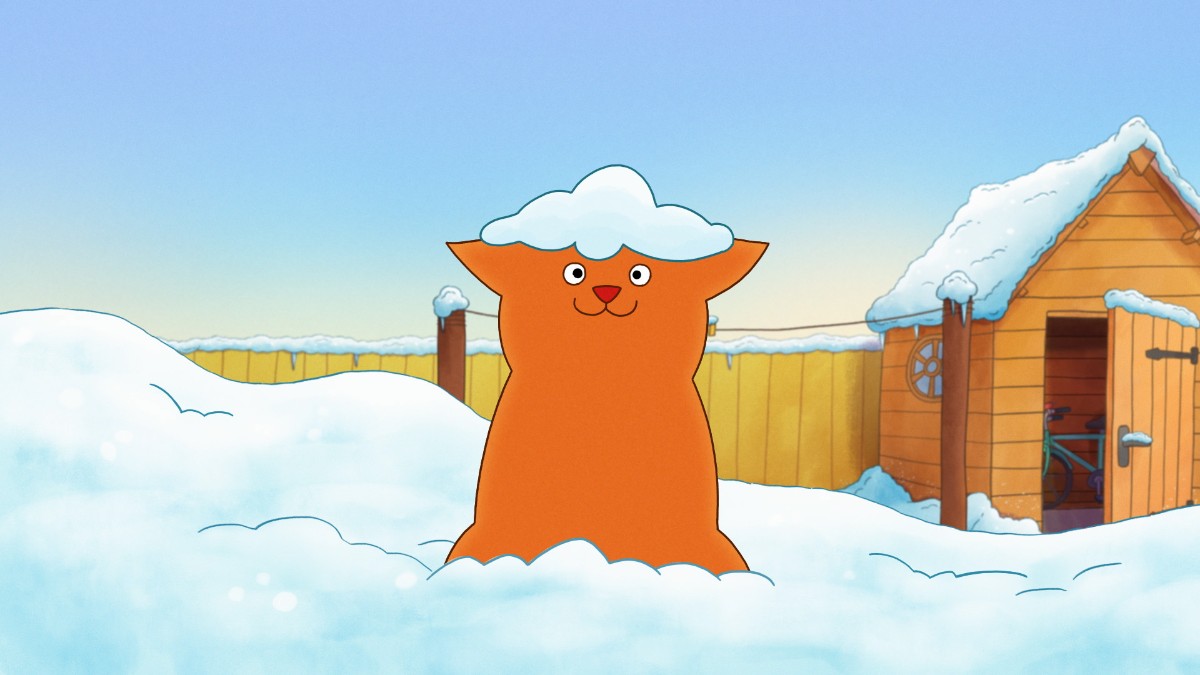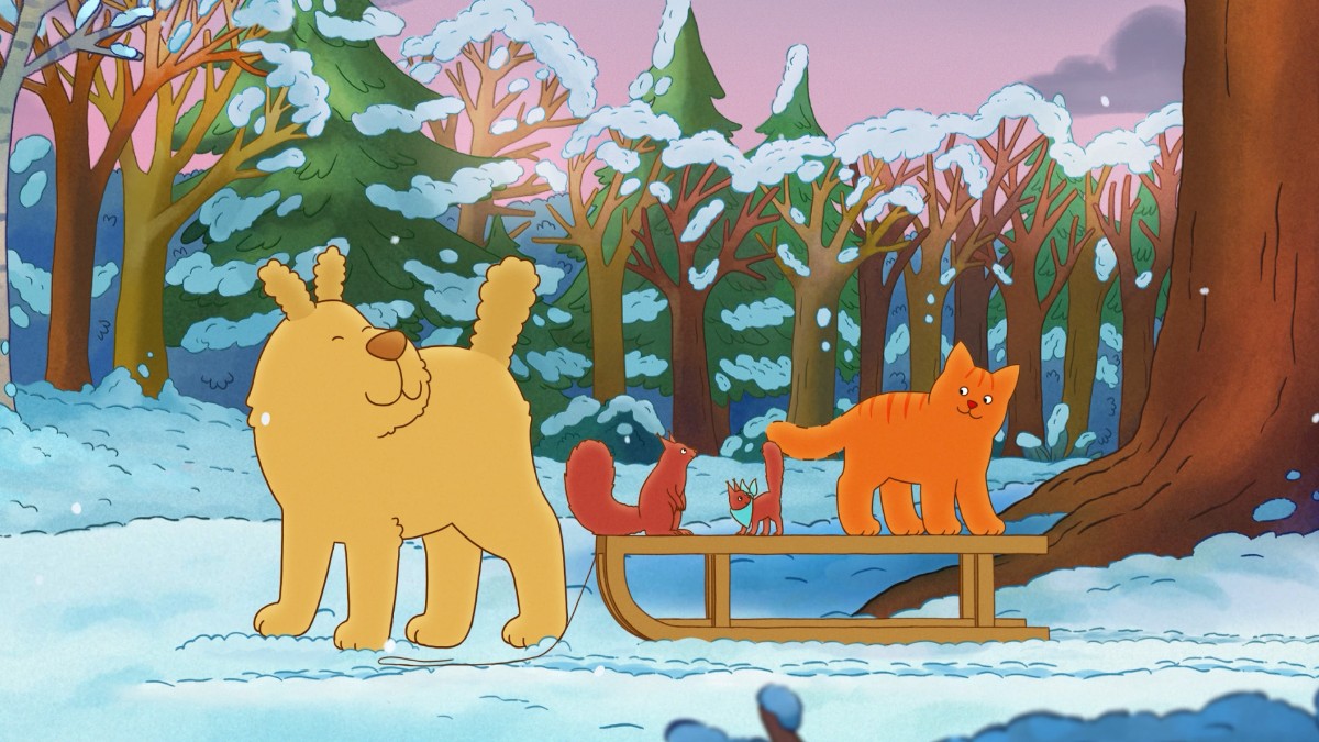 Op een winterse dag ontdekken Dikkie Dik en Poes Muis iets nieuws: sneeuw! Maar er is ook een nieuwe buurtgenoot; een grote, luidruchtige hond die Blaf heet. Brr, daar houden de poezen niet van! Dikkie Dik en Poes Muis gaan er snel vandoor en onderweg ontdekken ze een slee. Leuk om mee van de duinen af te zoeven! Op weg naar de heuvels komen ze al sleeënd hun oude vrienden tegen zoals de schapen en eekhoorntjes, maar maken ze ook nieuwe vrienden met de hazen. Ondertussen blijft Blaf hen overal volgen, maar is hij wel zo eng of wil hij gewoon een nieuwe vriend voor Dikkie Dik zijn?