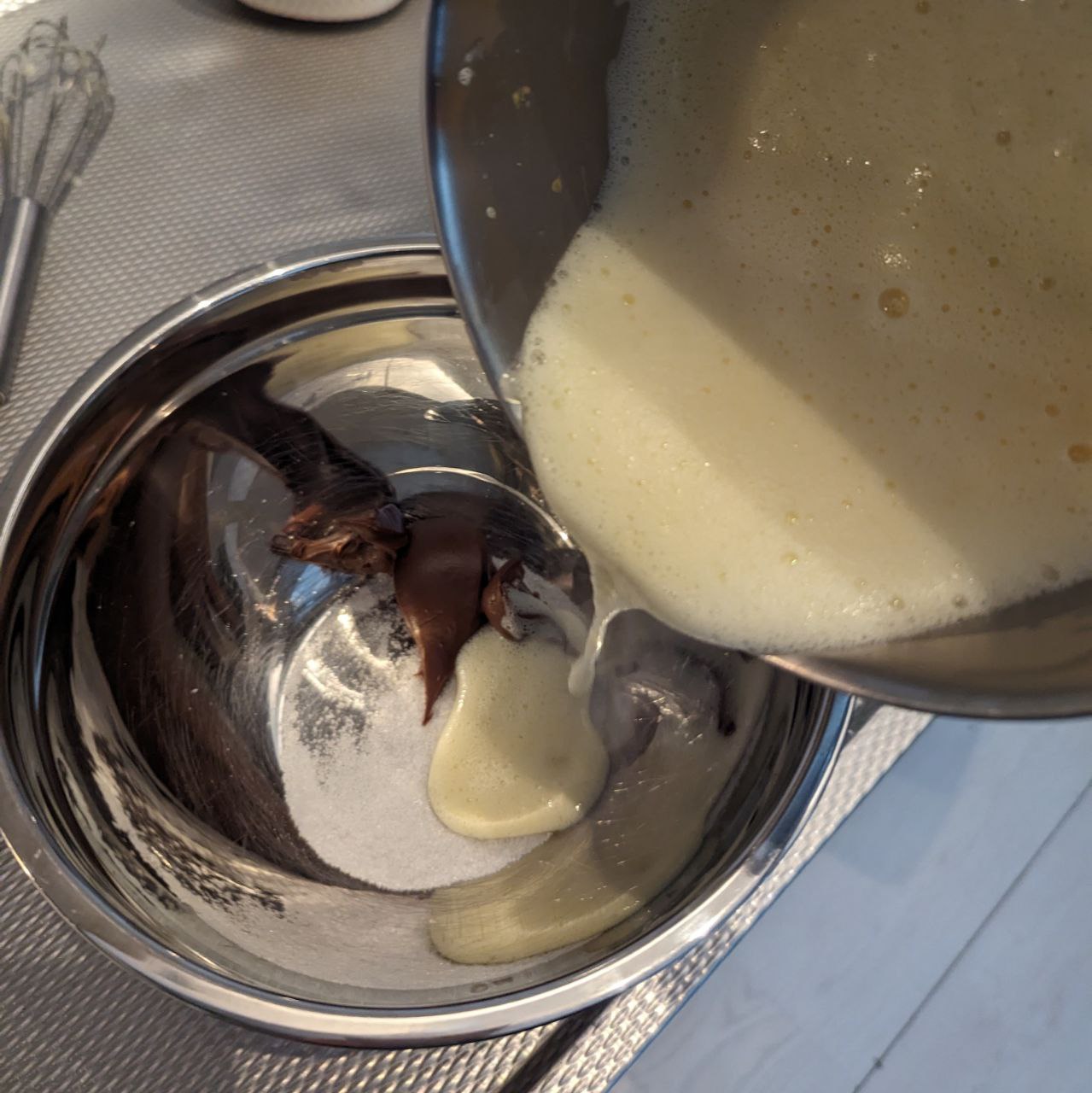 Breng de melk tegen de kook aan en giet al kloppend bij dit mengsel. Doe alles samen in de pan en breng al roerend aan de kook. Meng vervolgens 60 gram van de hazelnootpasta met dit mengsel en de vanillesuiker. Bestrooi met het overige suiker en laat helemaal afkoelen. Dit duurt ongeveer een uur, of sneller als je het in de diepvries zet.