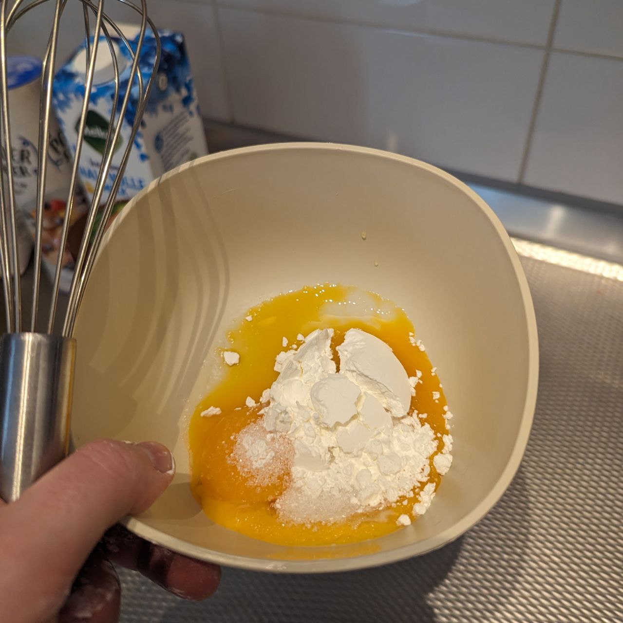 Splits de eieren. We gebruiken alleen de dooiers. Klop deze los met 1 eetlepel van de suiker en de maïzena.