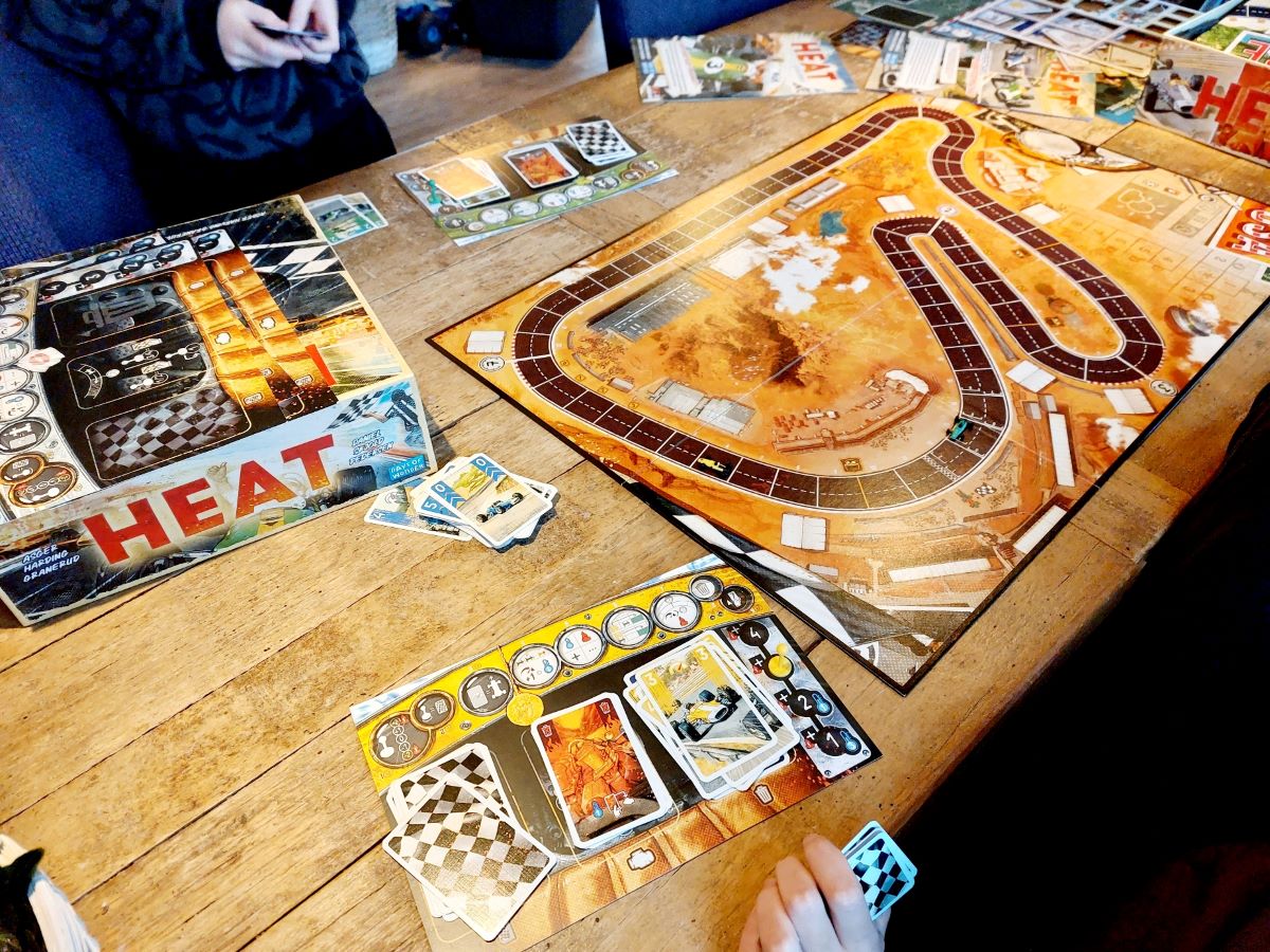 Bij het uitpakken van de doos zien we een zeer uitgebreide inhoud. Twee speelborden en heel veel kaartjes en attributen. Er is een basisspel en expertspel, met de waarschuwing om vooral eerst het basisspel onder de knie te krijgen. Wat is het doel van het spel Heat? Natuurlijk komt dat neer op zo snel mogelijk een aantal rondes racen en je medespelers verslaan. Maar dat klinkt makkelijker dan het is. Want te veel gas geven en je vliegt uit de bocht. En zit je wel in de juiste versnelling? En als je even niet goed oplet, dan word je natuurlijk direct ingehaald. Het is in ieder geval niet een simpel rondje racen door te gooien met een dobbelsteen!