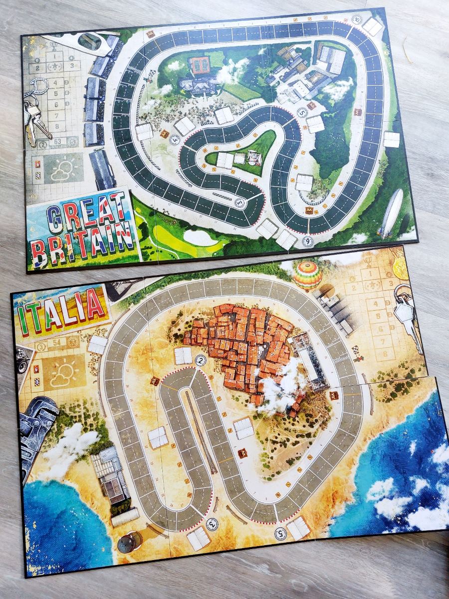 - Twee dubbelzijdige speelborden met vier circuits: VS, Frankrijk, Groot-Brittannië en Italië.
