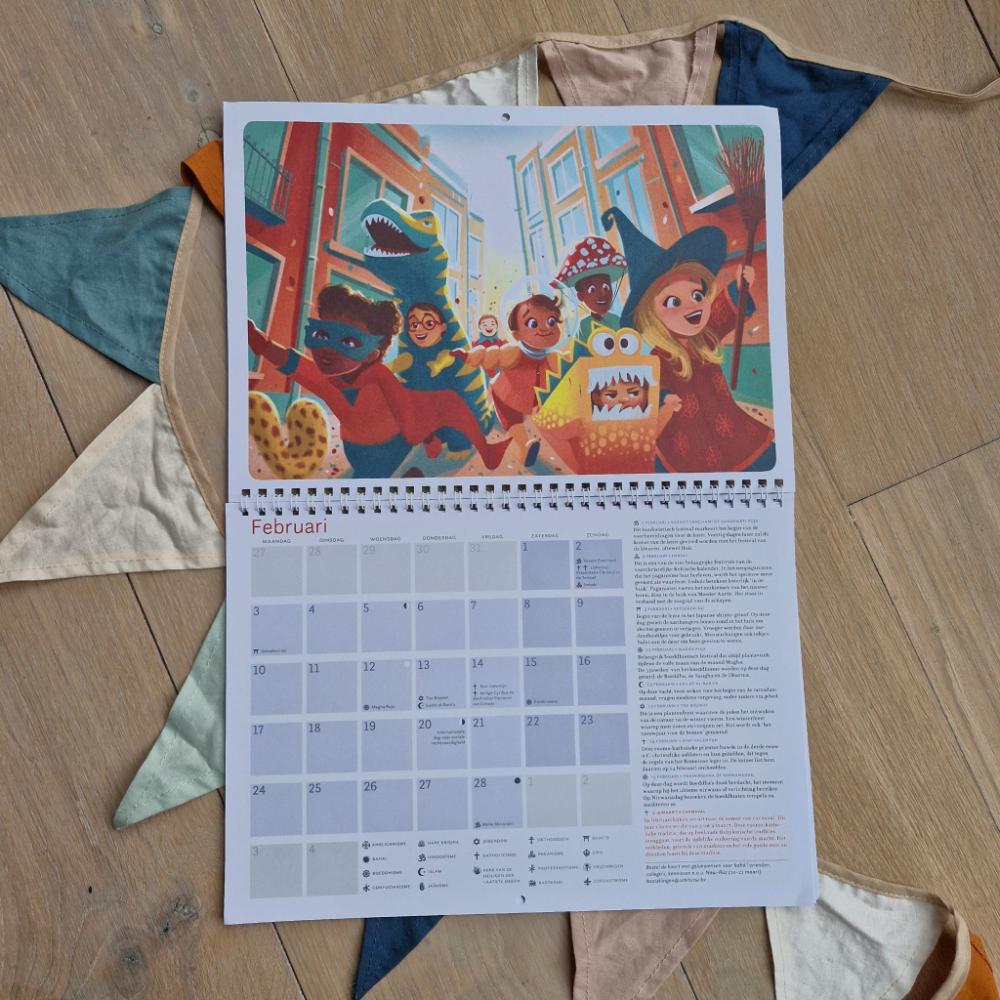 Het feest dat in het rood is weergegeven wordt afgebeeld in de grote illustratie bij elke maand. Dit is gedaan in heel kleurrijke illustraties, gemaakt door Stephanie Dehennin. Dit is al de 27e editie van deze jaarkalender, elk jaar wordt er een illustrator gekozen. Stephanie Dehennin heeft dit al voor de 2e keer gedaan in deze editie. Zij heeft door middel van gedetailleerde tekeningen geprobeerd weer te geven welke symbolen en emoties er centraal staan bij het afgebeelde feest.