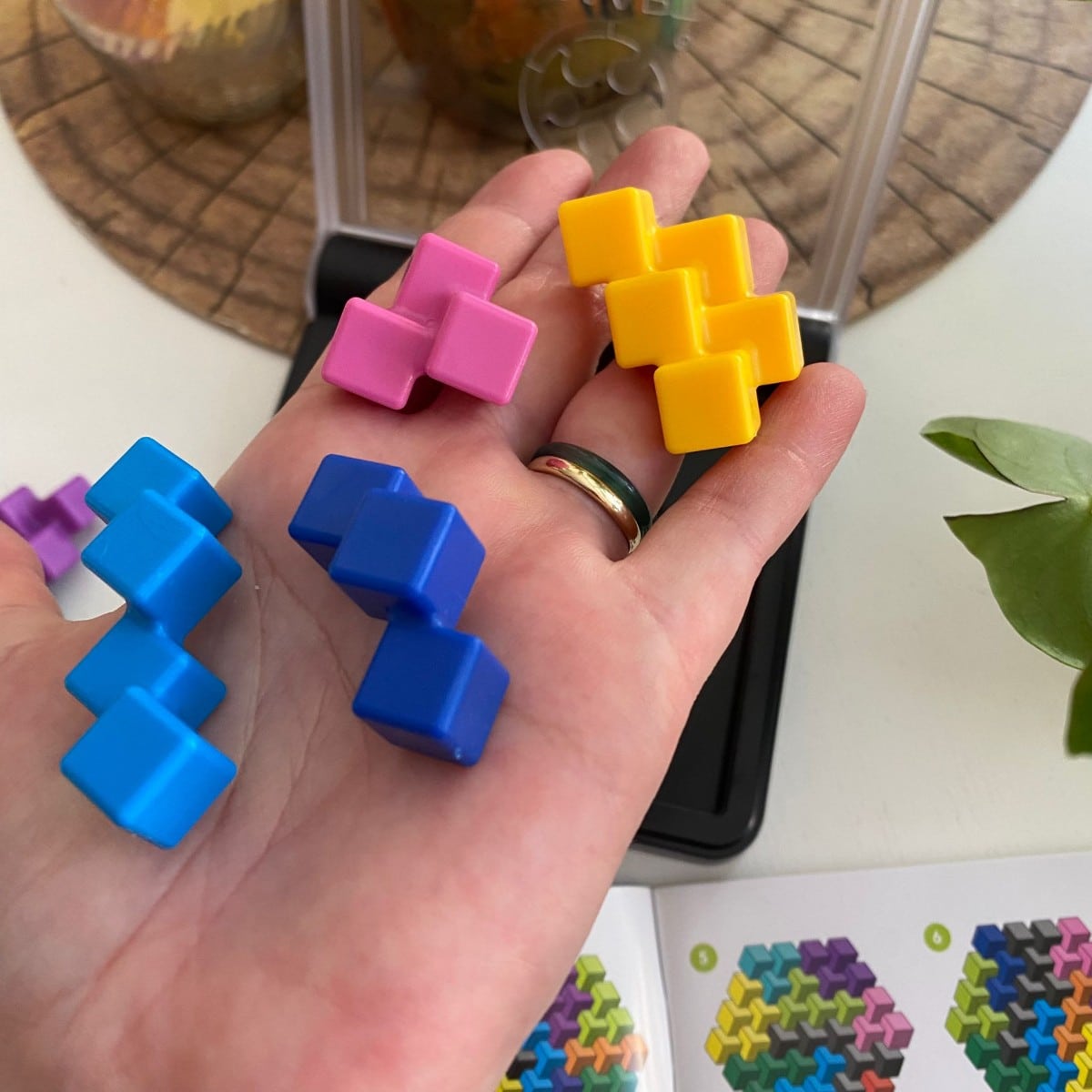 Soms moet je een blokje ook even oplichten wil je een ander kunnen plaatsen. Soms moet je net even een draai maken. Dit is precies de game die ik lekker wil doen als ik op de bank tv kijk. Of als ik aan het reizen ben. IQ Perplex is aangeraden vanaf 12 jaar maar mijn dochters van 4 en 9 spelen ook graag mee. Als we een opdracht gehaald hebben zetten we onze beginletter erbij. Zo doen we dat bij alle SmartGames. Soms zetten we er meerdere diverse op tafel en gaan dan alleen, en toch samen lekker spelen.