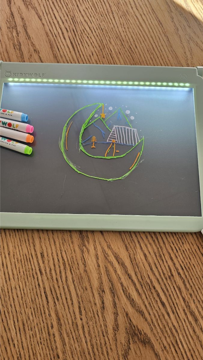Maar het echte plezier begint aan de achterkant van de tablet, waar een oplichtend zwart plexibord is geplaatst. Hier kunnen kinderen met vier meegeleverde neonmarkers tekeningen maken die niet alleen fel gekleurd zijn, maar ook ’s nachts oplichten voor een betoverend glow-in-the-dark effect. Dit geeft echt een magische draai aan de gewone tekensessies!