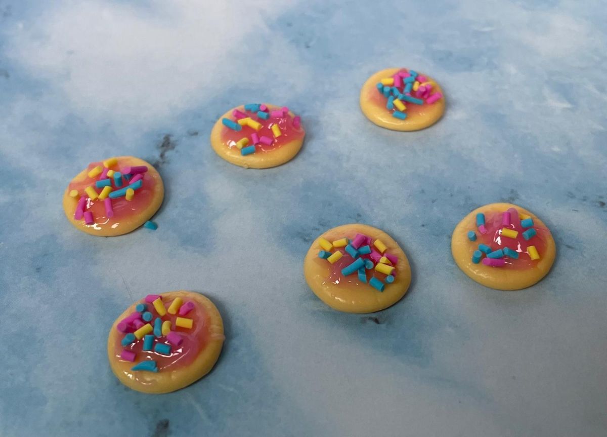 Het allertofste vind ik dat er epoxyhars bij wordt geleverd. Dit wordt uiteindelijk hard, en zo blijft je knutselwerk dus in elkaar zitten. De sprinkles blijven door het ‘glazuur’ op de koekjes geplakt, de tomaatjes en basilicumblaadjes blijven door de ‘pesto’ vastplakken aan de pasta. Dus mijn twijfel was als sneeuw voor de zon verdwenen, want ik zie nu heel goed waarom dit zo leuk is!