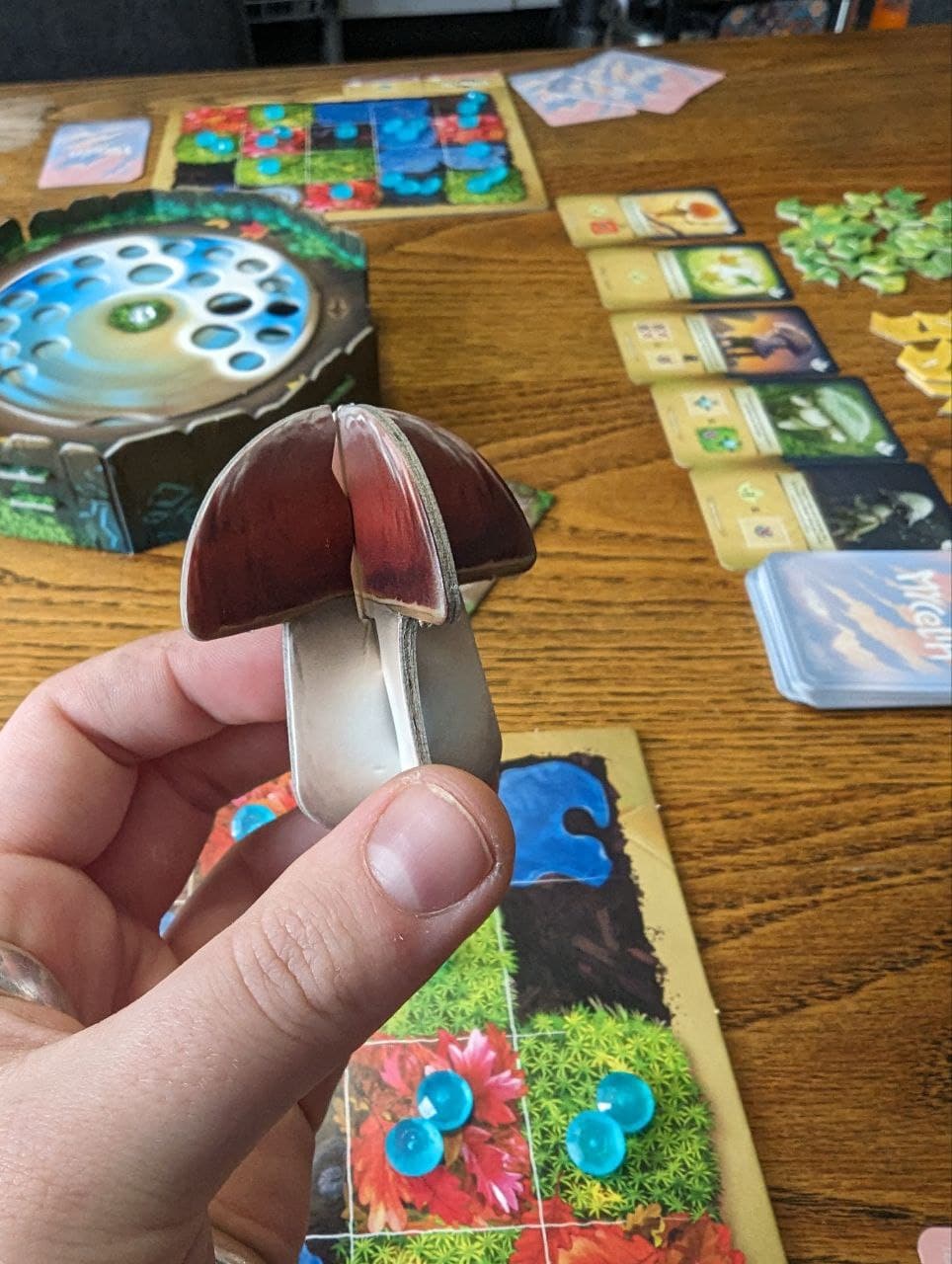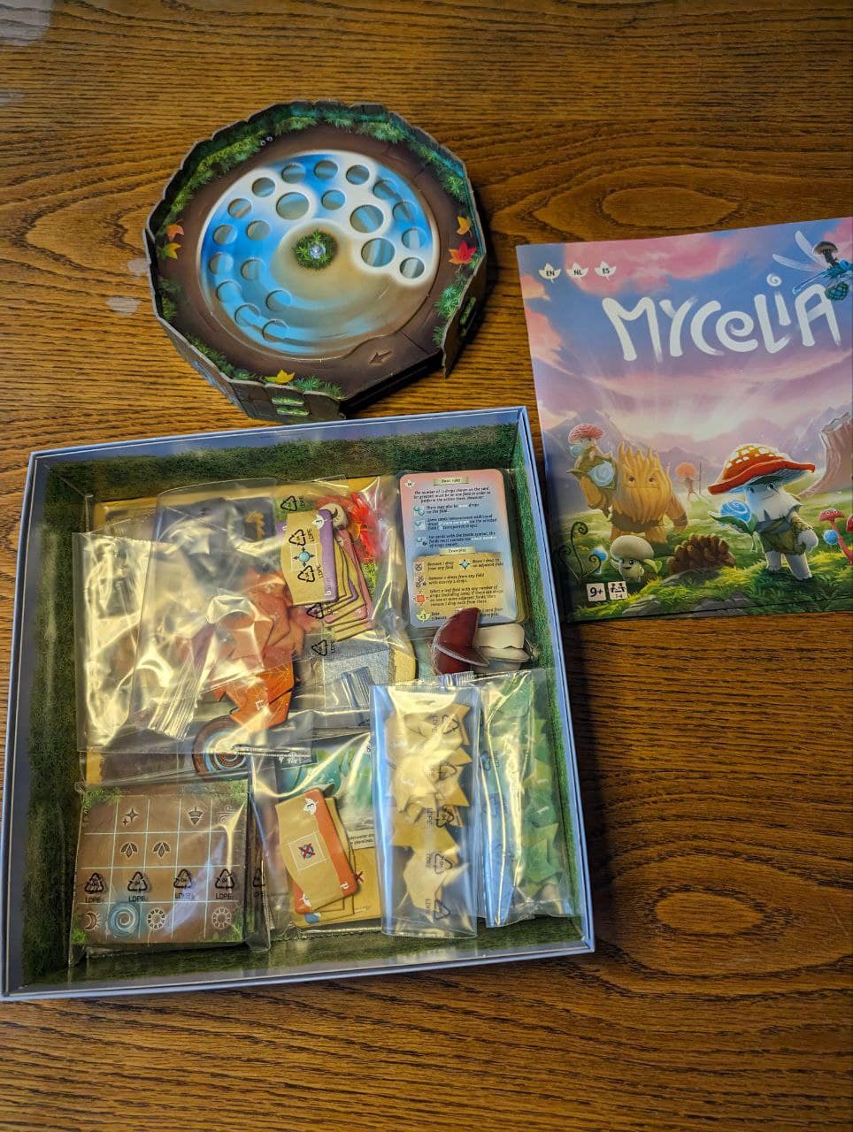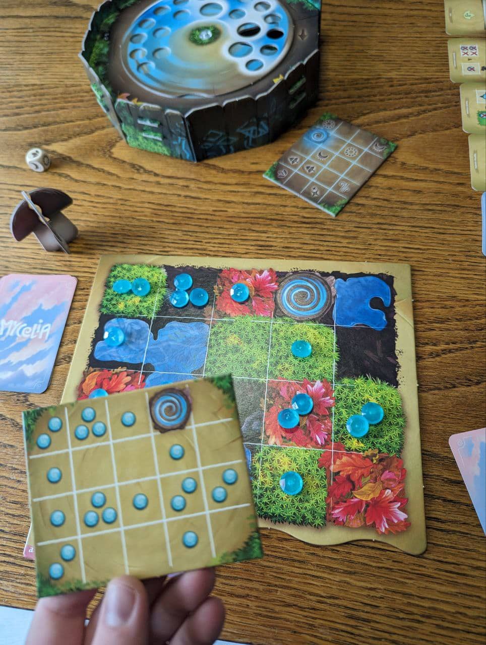 Tijdens het spelen zit je elkaar niet echt dwars, je speelt vooral je eigen spel. Sommige kaarten helpen naast jezelf ook de ander, dus op deze manier is er wel interactie. Het spel is gemakkelijk geleerd en is leuk om te spelen. Duidelijk ook geschikt voor met de kinderen of vrienden die minder bekend zijn met spelletjes. Een potje duurt ongeveer drie kwartier. Voor de meer gevorderde speler kan dit wat lang aanvoelen. Ook hier houd Mycelia rekening mee, er zijn namelijk opties om het spel uit te breiden. Dit geeft extra opties en moeilijkheid. Ook is er een solo variant, waarvoor andere speelstukken aanwezig zijn (zie foto in galerij hieronder). Ook deze onderdelen zien er prachtig uit.