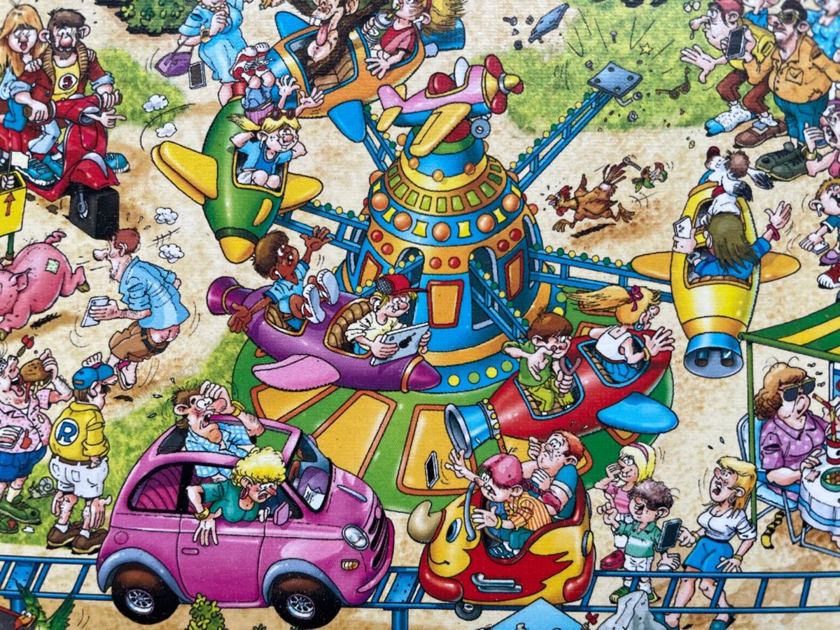 Het leuke van deze puzzels is dus dat ze onderling met elkaar verband houden. Want op de puzzel van het zwembad, komt er inderdaad een karretje van de achtbaan het terrein op gereden. En als je goed kijkt, zie je ook dat er op meerdere plekken iets in of uit de uit de puzzel lijkt te vliegen.