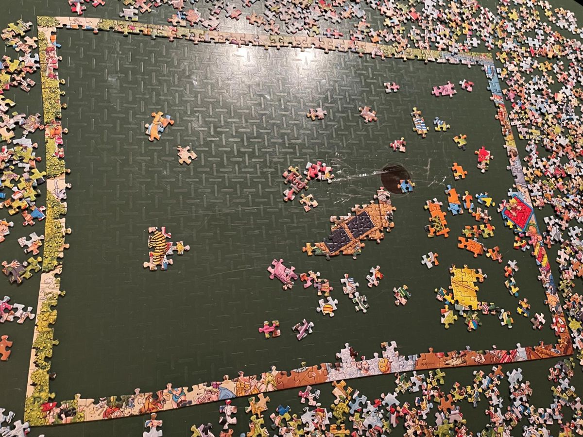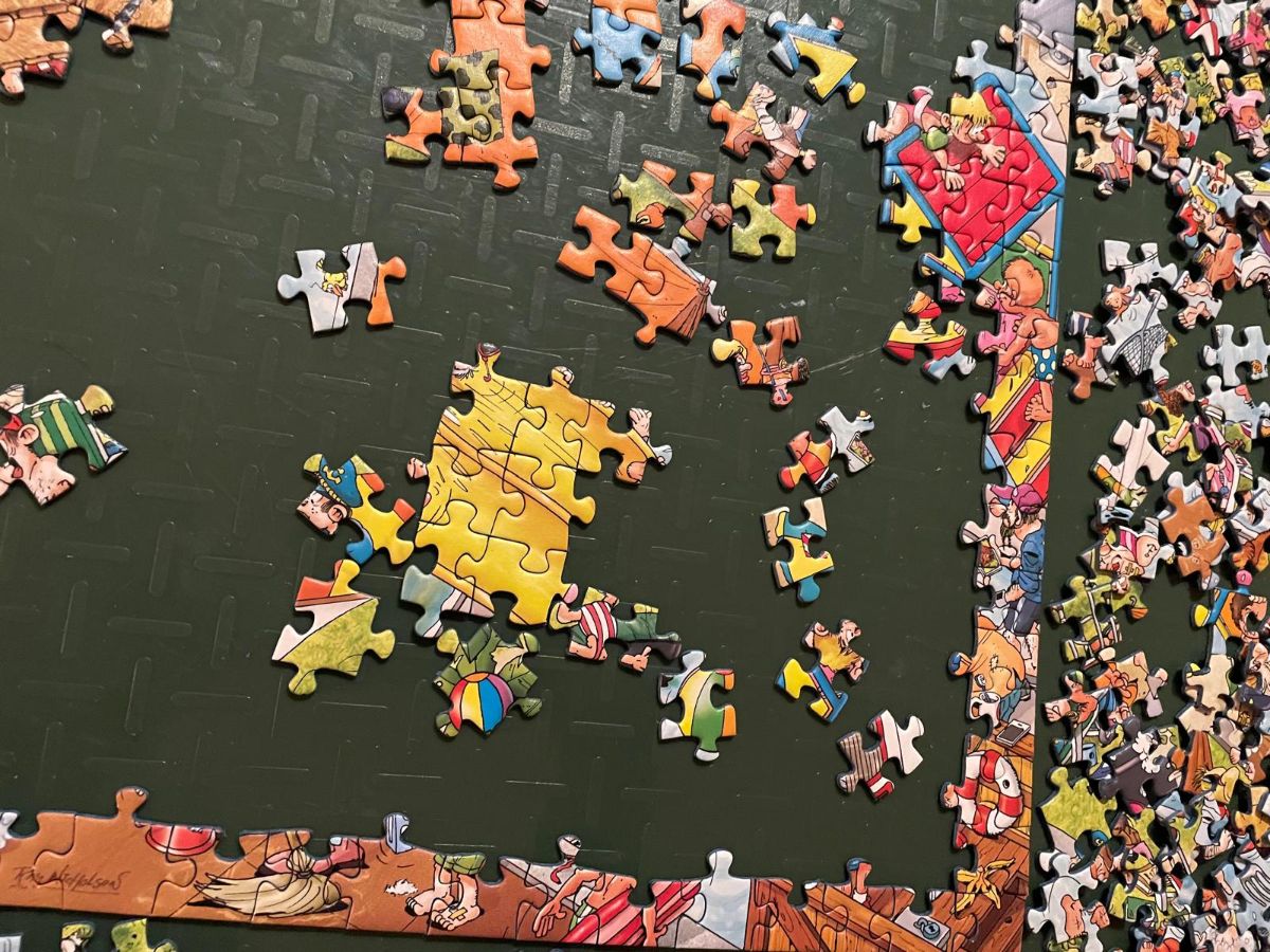De puzzels zelf puzzelen prettig. De stukjes sluiten goed op elkaar aan. De kleuren zijn mooi helder. Het is echt nog wel even goed zoeken, want omdat er zoveel poppetjes in staan, moet je goed kijken of je wel de goede heb. Wij zijn nu pas net een dag bezig, dus het volledige eindresultaat kan ik nu nog niet delen. Maar zodra de puzzel af is, zal ik deze foto hier zeker ook nog wel bij zetten!