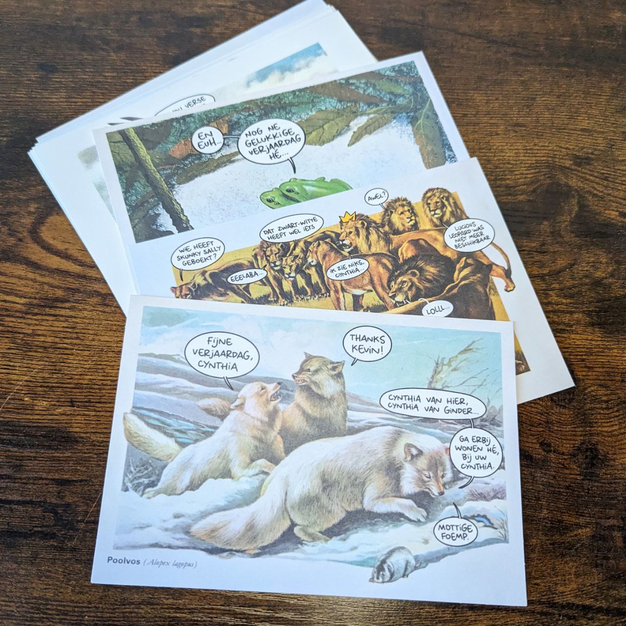 Iedereen zal wel herkenning vinden in een deel van zijn content. Ook zijn ze meestal ongeveer drie panels (drie plaatjes). Lekker kort en duidelijk dus. Deze posts zijn echter vrijwel altijd mensen. De verjaardagskaarten in deze kaartenset daarentegen, zijn dieren. Dit vind ik zelf alleen maar leuk. Ik hou van dieren én ze zijn met humor neergezet. Als je Arnoleon al volgt is deze set toch ook frisse humor en nieuw om te zien.