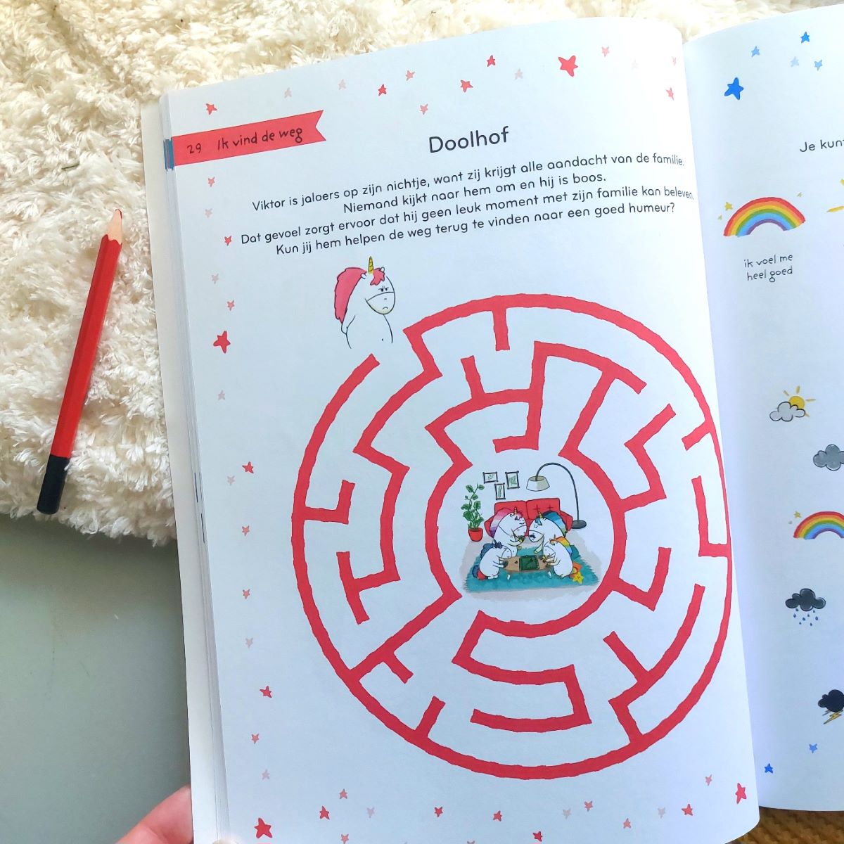Het is een gevarieerd en uitnodigend spelletjesboek. Er zijn kleurplaten, doolhoven, sudoku’s, zoekplaten en nog veel meer. In alle opdrachten zit een emotie ‘component’ verstopt. Bijvoorbeeld over verlegenheid, geduld hebben of omgaan met teleurstelling. Zo leren kinderen spelenderwijs dat deze gevoelens er soms kunnen zijn en wat je dan kunt doen. Zoals de opdracht Verbind elk gevoel met de juiste situatie. Of Vind via het doolhof de weg naar een goed humeur.